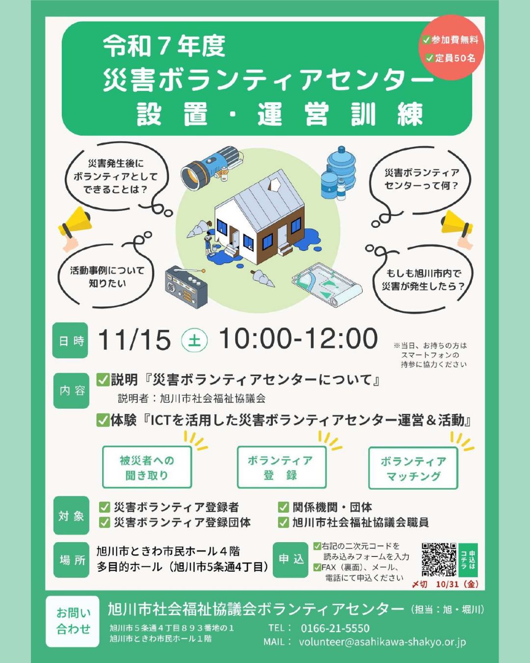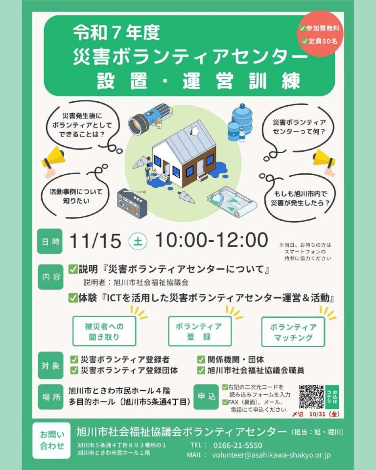 ✅急なご案内となり大変申し訳ございませんが、参加を希望される方は11/6(木)までに、ボランティアセンターまでお電話かメール、または公式LINEアカウント「旭川市社会福祉協議会ボランティアセンター」宛にご連絡ください(^^♪