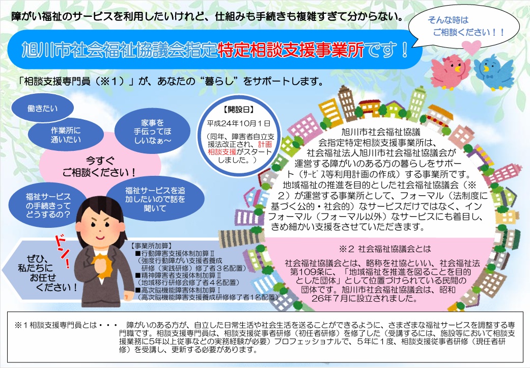 利用者が自立した日常生活又は社会生活を営むことができるよう、その利用者の心身の状況及びその置かれている環境に応じて、利用者の選択に基づき、適切な保健、医療、福祉、就労支援、教育等のサービスが、多様な事業所から総合的かつ効率的に提供されるよう配慮して計画相談支援を行います。