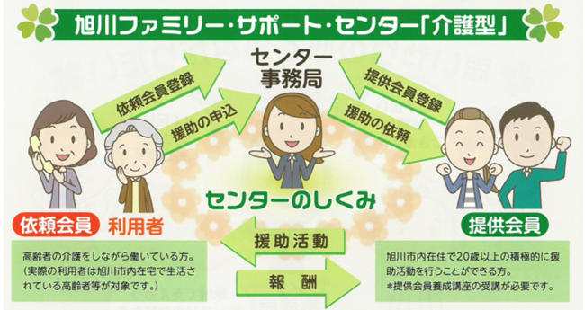 ファミリーサポートセンター介護型では、高齢者等が地域で安心して暮らしていけるように、簡単な家事支援や軽介護などの支援を行っています。