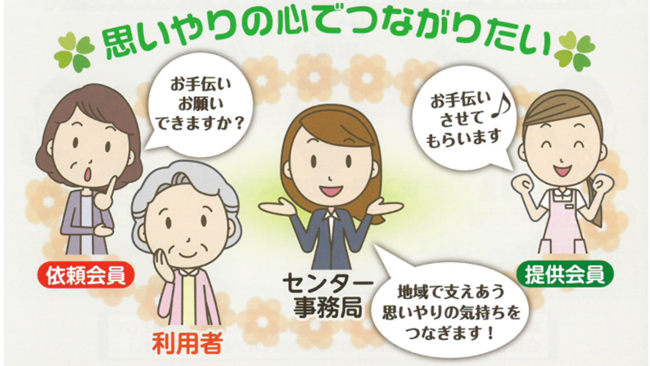 「支援を受けたい人」(依頼会員)と「支援を行いたい人」(提供会員)が会員となって、地域で支え合えるように、その橋渡しをセンター事務局で行っています。