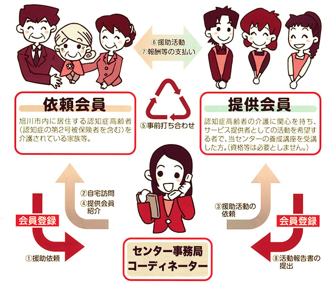 認知症サポートセンターは、認知症高齢者やその家族が地域で安心して暮らせるように、認知症の方の見守りやお話し相手の支援を行っています。