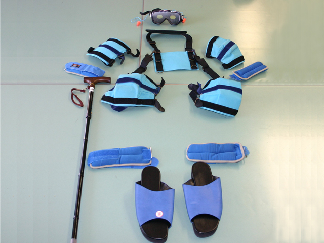 プロジェクター、スクリーン、ワイヤレスアンプ、車いす、高齢者擬似体験セット、アイマスク、白杖等